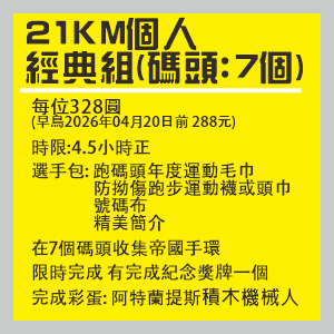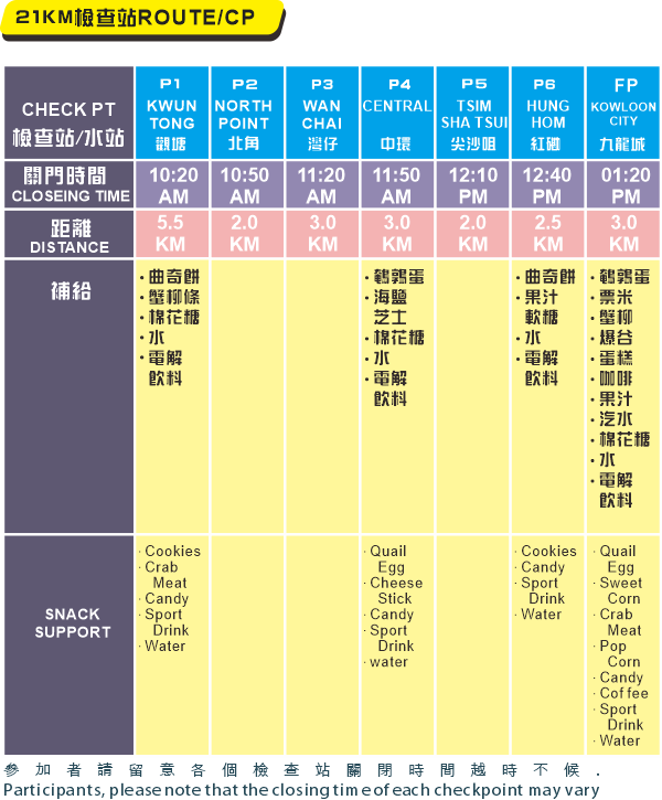 - 關於21公里組別, 參加者無需到郵輪碼頭(CP:1A) 由土瓜灣直達 觀塘(CP:1B).