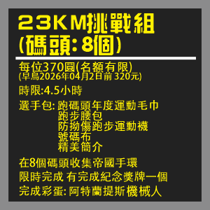 - 所有參加者限時內完成活動均可獲完成獎牌1個。