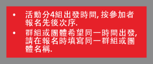 5. 參賽者應緊隨賽道標示前進,嚴禁另走捷徑,參賽者若被發現違規,將被取消資格。
